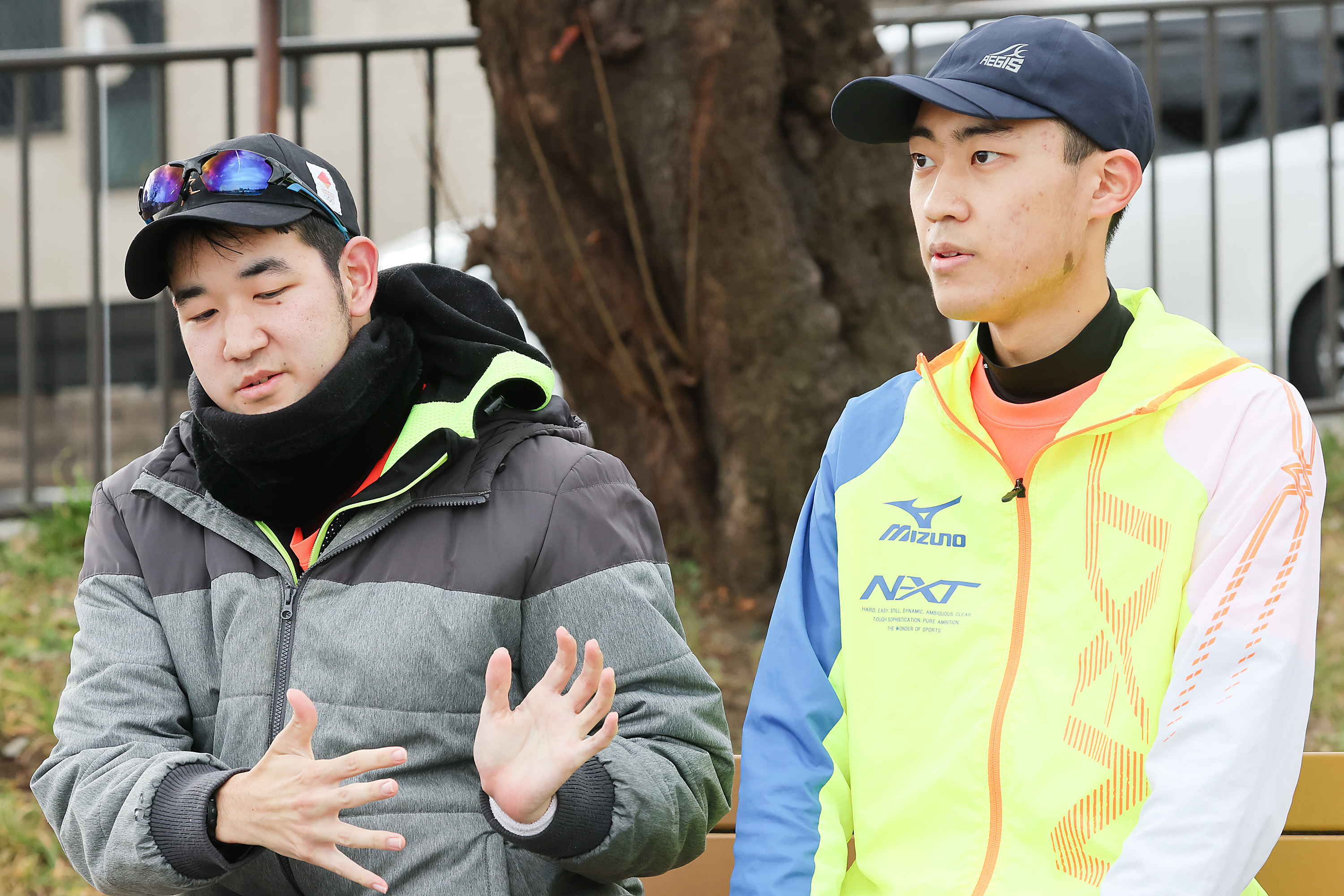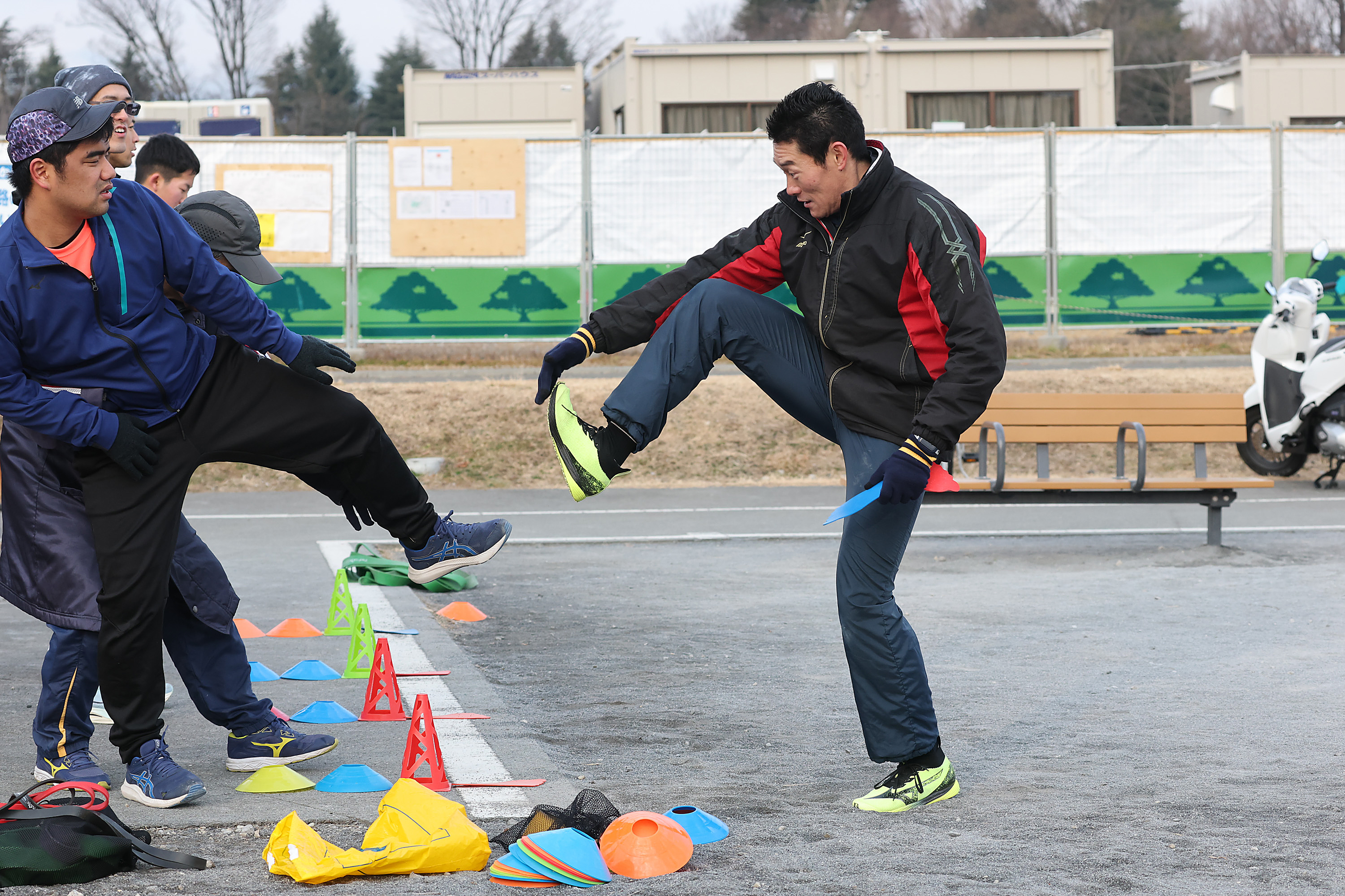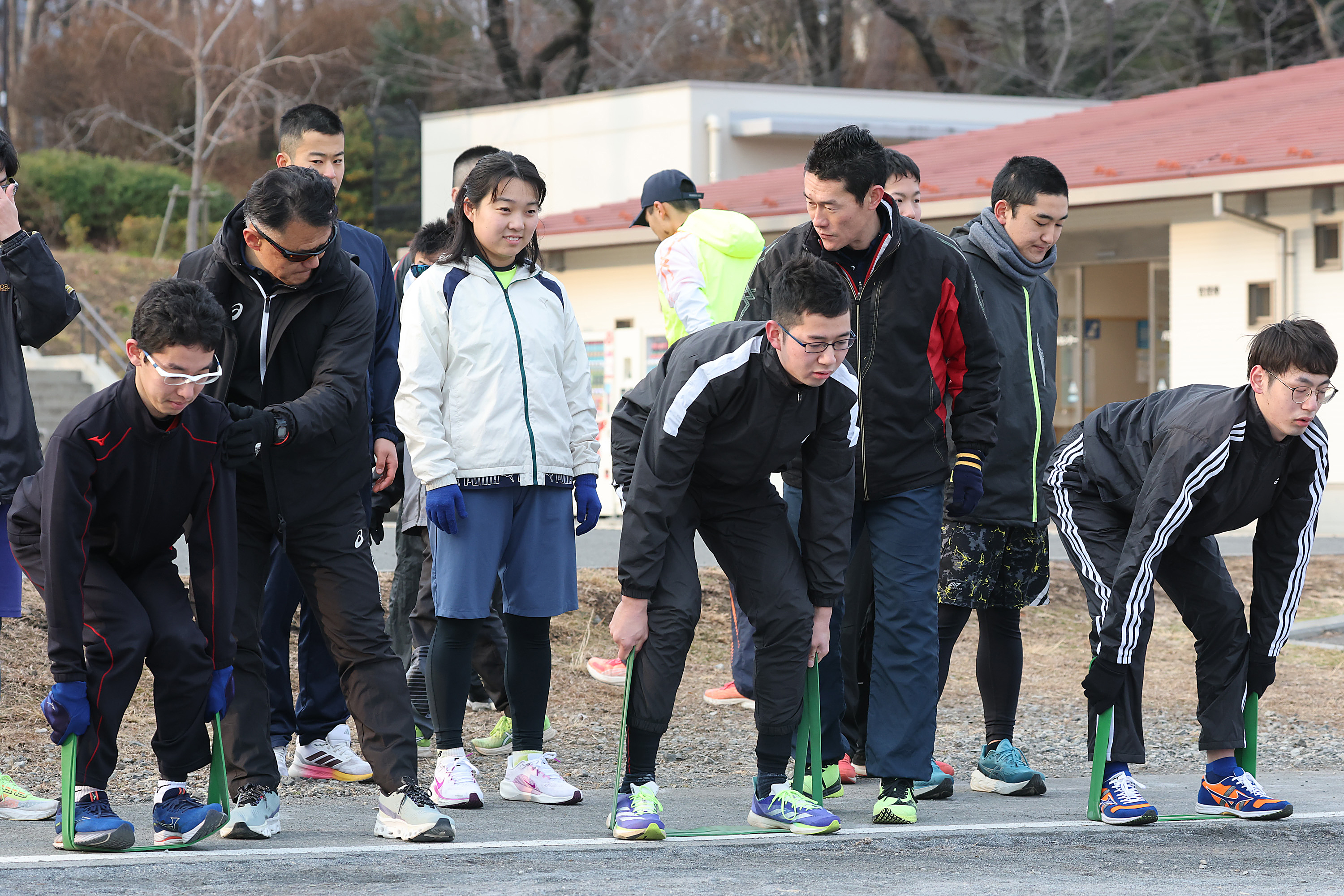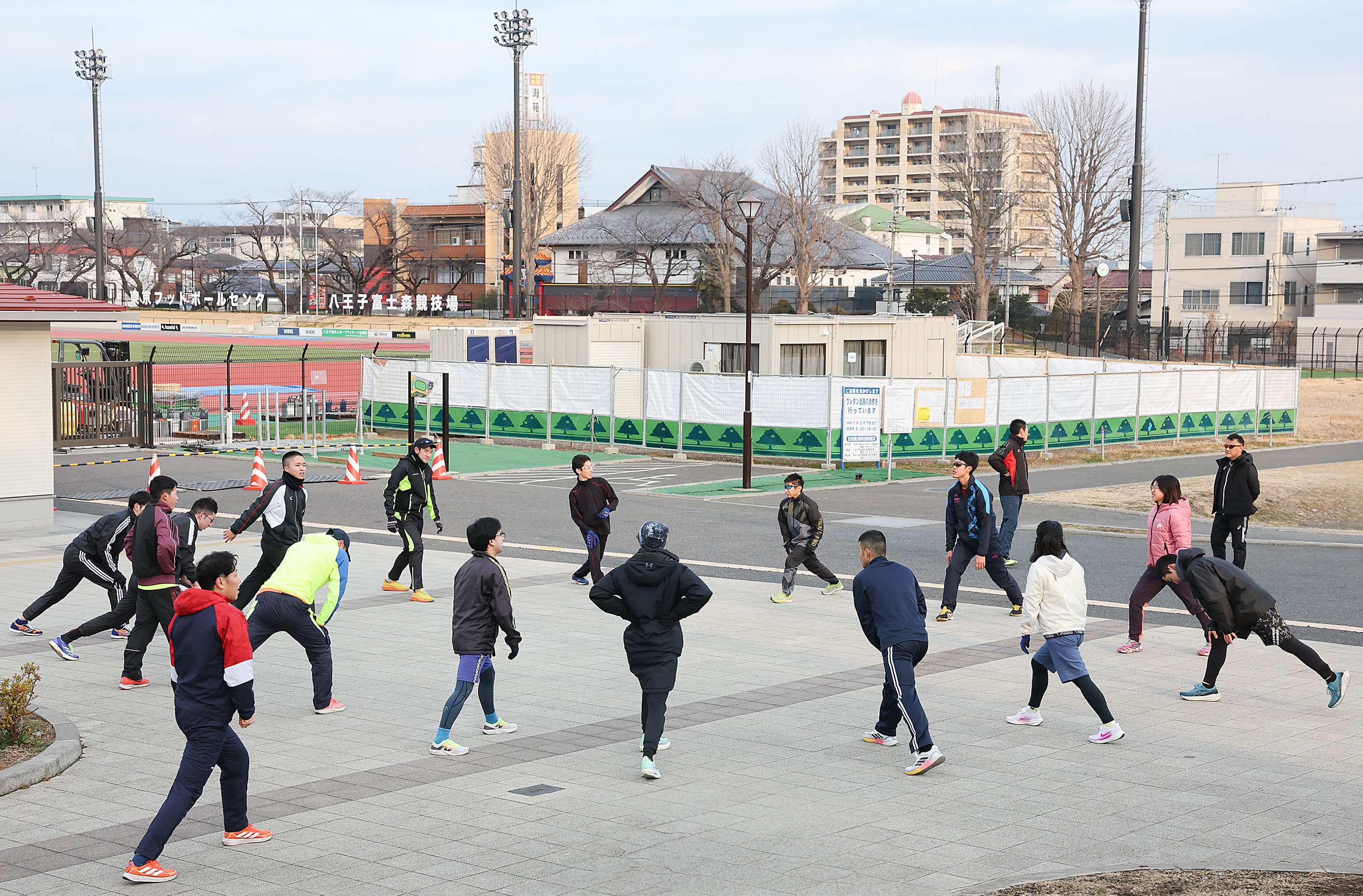 取材に訪れた1月25日の練習は朝7時半から。メンバーらが続々と競技場に集合し、各々が「おはようございます!」と元気に挨拶をかわしてスタートした。全員で競技場の外周をジョギングしてウォーミングアップしたあと、輪になって入念に柔軟体操を行った。次にゴムのチューブの張力を利用して臀部に刺激を与え、また縄跳びでモモ上げや足首の角度などを意識してから、正しいフォームでダッシュを繰り返す練習に取り組んだ。佐藤さんが一人ひとりに「そう! 1本目よりうまくなってるよ!」「集中してやれば自分に返ってくるからね」などと声をかけると、メンバーも「はい!」と応えていた。