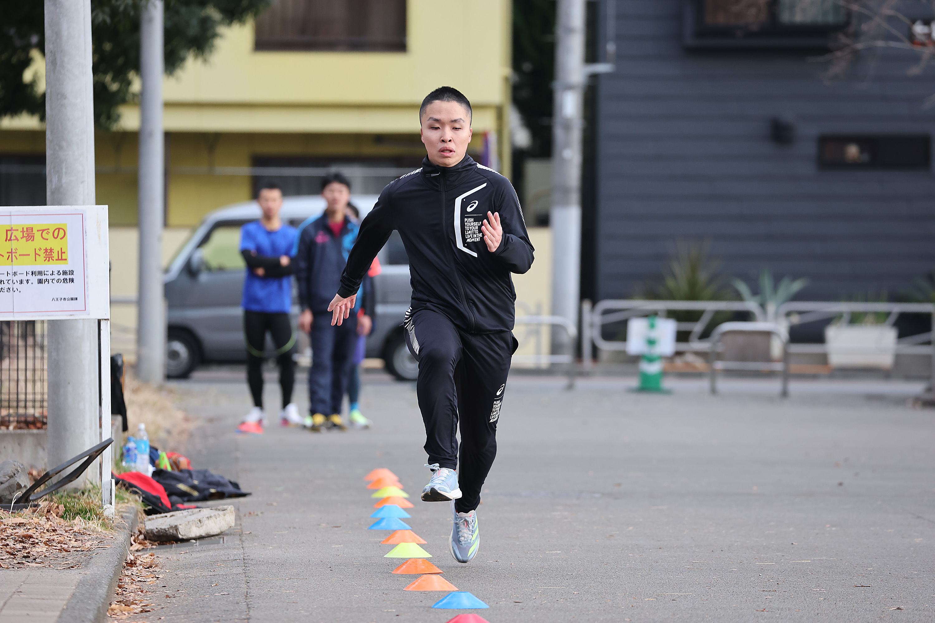 その後は、短距離組と長距離組に分かれて、それぞれのトレーニングを実施。短距離組は、マーカーコーンを使用して接地の姿勢やピッチ向上のドリル練習に臨み、長距離組は翌日に大会を控えていたことから外周をジョギングしてコンディション調整を行った。