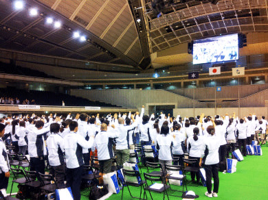 猪瀬知事の激励のことばがあり、その後、東海大学付属高輪台高等学校吹奏楽部によるオープニングの「威風堂々」の迫力あるマーチング演奏の中、TEAM Sparkが、ダイナミックなチアリーディングのパフォーマンスを披露してくれました。金澤翔子さんによる揮毫も披露され、「飛翔」の文字が会場に高く掲げられました。