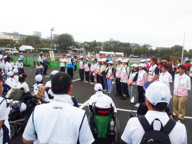 閉会式終了後、東京都選手団の解団式が行なわれました。旗手の和西努さんから東京都スポーツ振興局・細井優局長に団旗が返還され、東京都選手団が待ち望んでいた大会が終了しました。今大会で得た経験を、スポーツの場面だけでなく様々な場面において活かして欲しいと思います。来年の全国障害者スポーツ大会は「長崎がんばらんば大会」です。毎年やってくる大会の積み重ねが7年後に繋がっていくのではないでしょうか。