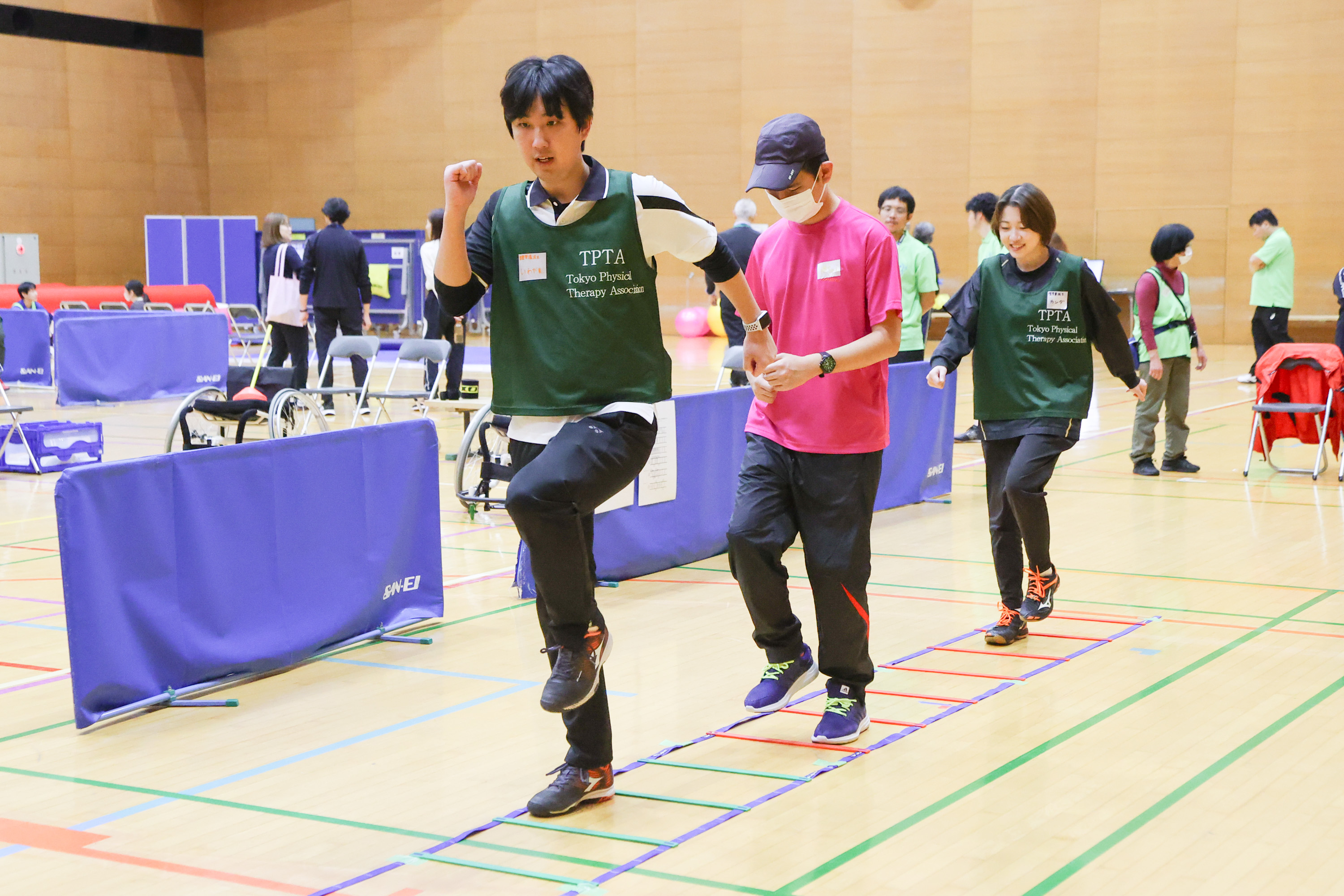 「ウオーキング・ランニング」プログラムは、理学療法士が参加者をサポートする。この日も、一人ひとりの状態に合わせて脚の上げ方や、身体の使い方等をレクチャーし、歩行を支援していた。東京都理学療法士協会の岩山睦(いわやまあつし)さんは、「ゲームの要素も取り入れ、楽しみながら自然に歩いたり走ったりできるようフォローしています」と語る。岩山さんによれば、先天性の全盲の人は走る経験がなかったり、少なかったりするため、ランニングの前傾姿勢に恐怖心を持つ場合が多いが、このプログラムでは理学療法士が寄り添い、壁を使ってランニングのフォームの感覚を掴めるよう指導することで、その日のうちに走れるようになる人もいるという。「このユニバーサルタイムでの体験が、日常生活を前向きに過ごすきっかけになれば」と、メンタル面に及ぼす影響についても話してくれた。