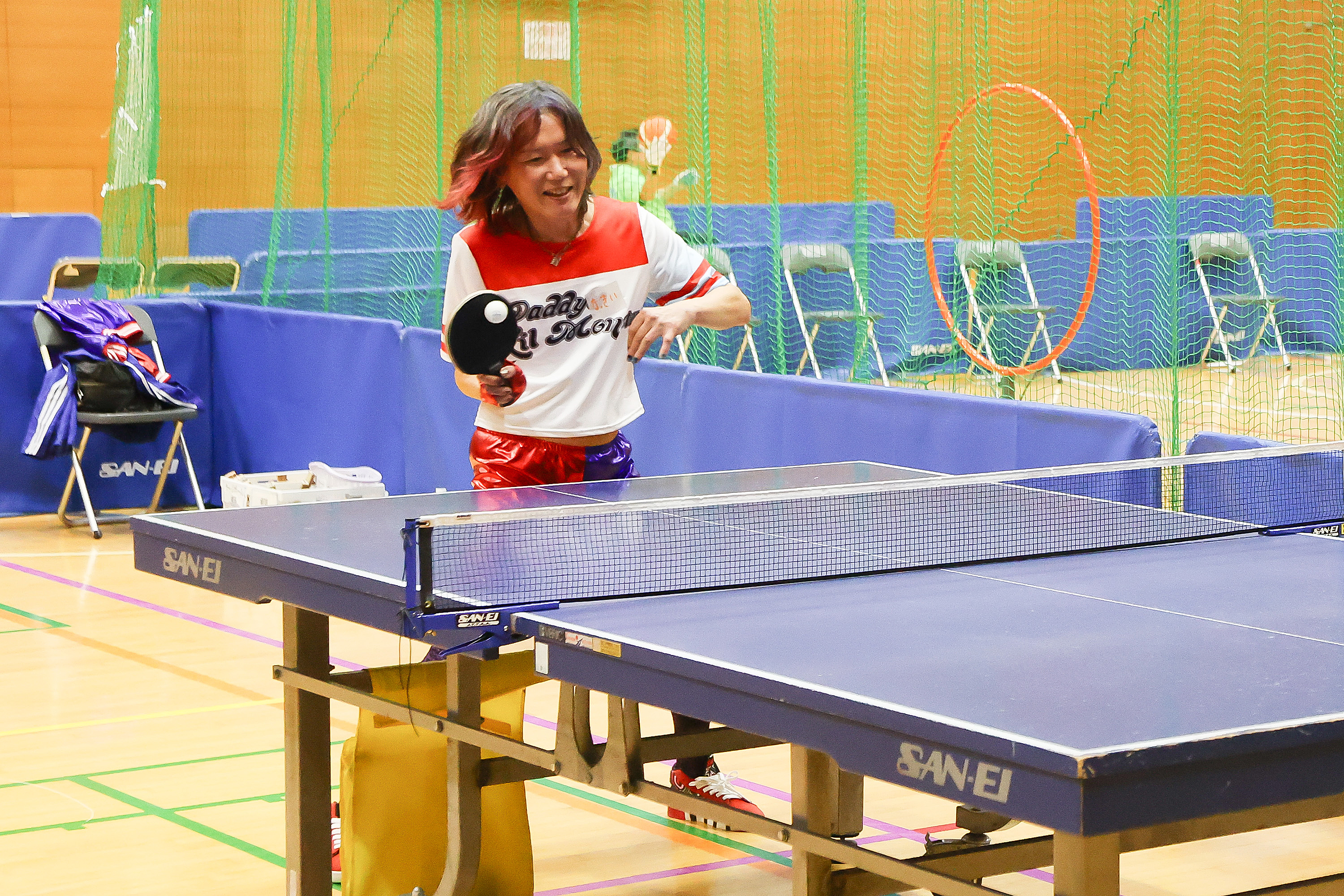笑顔を見せながら卓球でスタッフと打ちあう中井さん